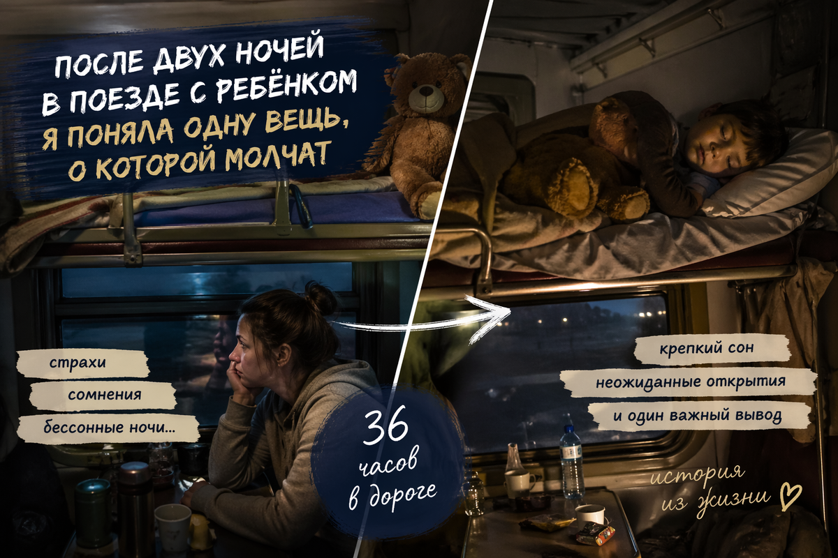 Днём дорога с ребёнком ещё похожа на приключение. За окном всё время что-то меняется, в вагоне идёт своя жизнь, ребёнку интересно, а тебе кажется: "Ну ничего, справимся". Но ближе к ночи у мамы внутри включается совсем другой режим. Потому что ночью поезд перестаёт быть просто дорогой. Он становится местом, где ты уже не отдыхаешь, а прислушиваешься к каждому шороху. Особенно если рядом маленький ребёнок. Мы ехали две ночи. И если честно, именно они для меня оказались самыми тревожными во всей этой дороге. Моему сыну тогда было шесть с половиной лет. Для него это было большое путешествие. А для меня - две ночи, которых я заранее боялась. Я боялась , что он не уснёт, что будет крутиться, просыпаться, капризничать, что я сама не сомкну глаз и просто не справлюсь. А потом оказалось, что самое трудное было совсем не там, где я ждала. Спать ему предстояло на нижней полке. Рядом на другой нижней полке спала моя мама. Но слово «спала» тут, конечно, слишком смелое. Потому что на самом деле м