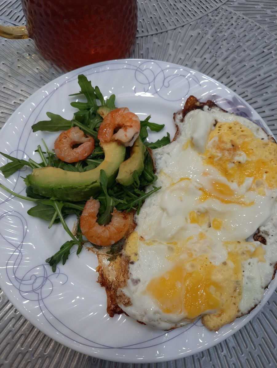 На завтрак была яичница с руколой, креветками и авокадо.