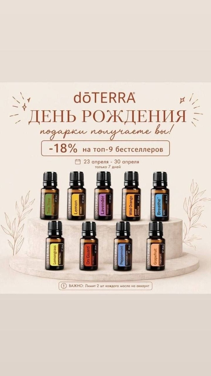 🥰😍 В честь 18-летия любимой компании на Российском рынке ОТГ: -18% на топ-9 бестселлеров, которые разлетаются в обычные дни как горячие пирожки 🔥 🔥 🔥 Сроки проведения акции: 🗓 23 апреля - 30 апреля, только 7 дней. 🔔СТАРТ 23 АПРЕЛЯ В 15:00 МСК‼️ 💧Лимон 15мл 1280₽ (13.9пв) вместо 1560р🔥 Артикул: 60204770 💧Чайное дерево 15мл 2082₽ (22.9пв) вместо 2540₽ 🔥 Артикул: 60212411 💧Лаванда 15мл 2280₽ (25.4пв) вместо 2780₽🔥 Артикул: 60204729 💧Дикий апельсин 15мл 1107₽ (11.4пв) вместо 1350₽🔥 Артикул: 60204880 💧Бриз 15мл 2330₽ (25.4пв) вместо 2840₽ 🔥 Артикул: 60204746 💧Лемонграсс 15 мл 1100₽ (13.1пв) вместо 1340₽ 🔥 Артикул: 60204776 💧Он Гард 15мл 3370₽ (34.4пв) вместо 4110₽🔥 Артикул: 60204773 💧Перечная мята 15мл 2165₽ (22.9пв) вместо 2640₽ 🔥 Артикул: 60204786 💧Грейпфрут 15мл 1690₽ (18пв) вместо 2060₽ 🔥 Артикул: 60204740 ➡️ВАЖНО: Лимит 2 шт каждого масла на аккаунт 👌🏽 Не ждите последнего дня,