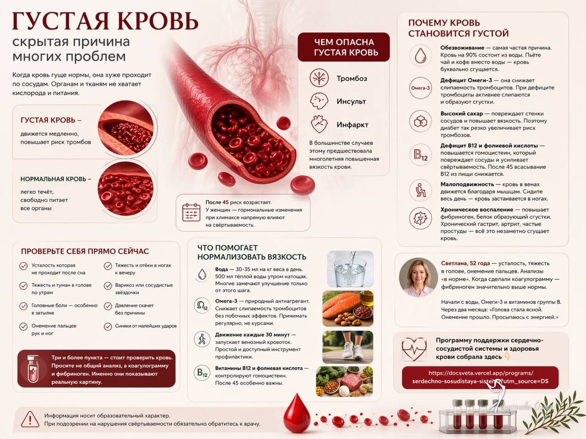 В практике я регулярно вижу одну и ту же картину: усталость, тяжесть в голове по утрам, эпизоды головной боли, онемение пальцев, нестабильное давление. Симптомы есть, обследования формально «в норме», а самочувствие не восстанавливается. Одна из частых причин — повышенная вязкость крови. Это не отдельный диагноз, а функциональное состояние, которое напрямую влияет на работу сосудов, сердца и уровень кислородного обеспечения тканей. Подробнее в MAX или во ВКонтакте: 1. https://vk.com/fitnessppeda 2. https://max.ru/fitnessppeda