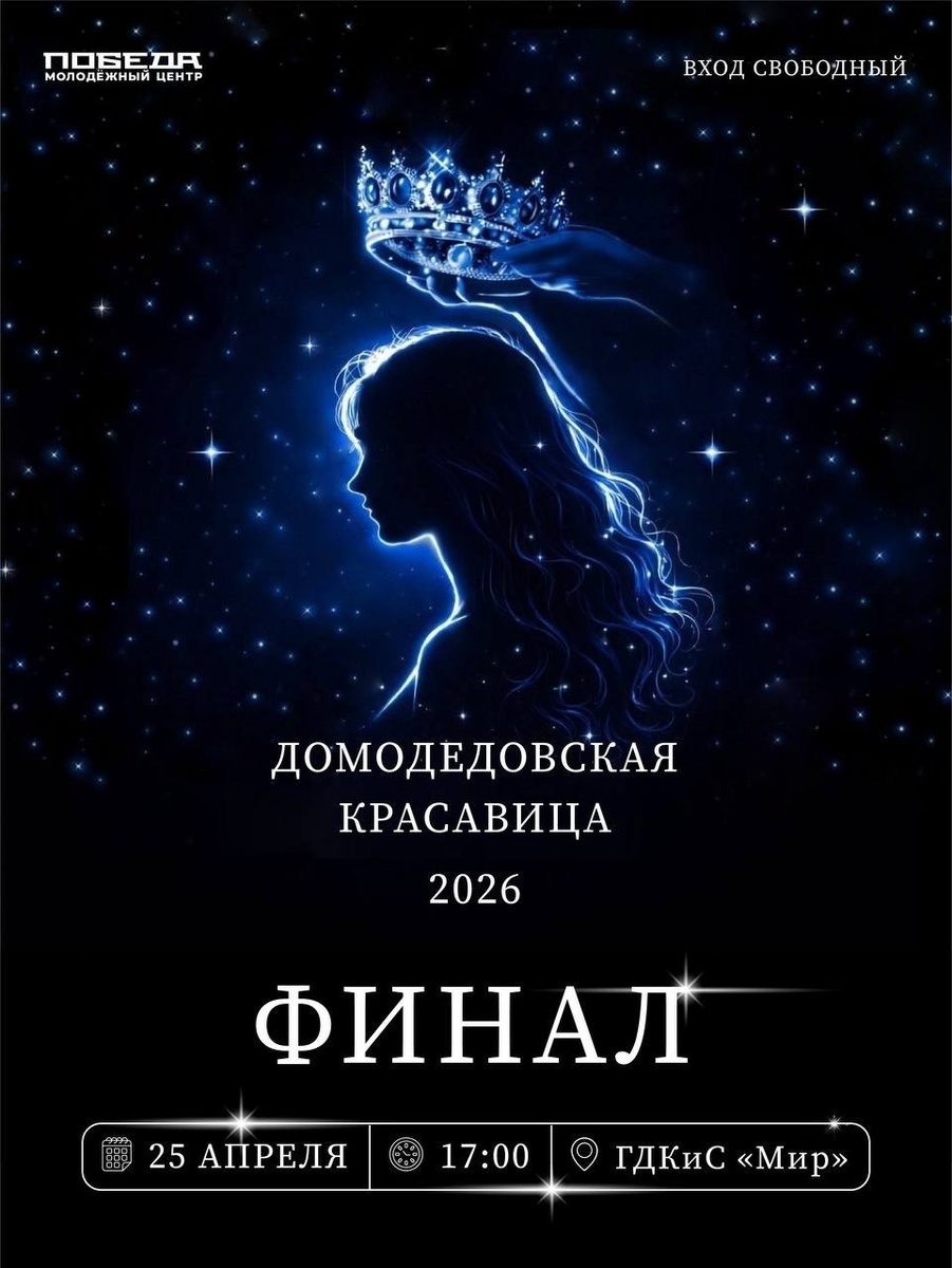 ✨ Финал конкурса «Домодедовская красавица»! 🔥 Звезды сошлись! Конкурс, за которым следил весь город, выходит на финишную прямую. Это не просто финал – это настоящее шоу, где грация встречается с талантом, а мечты становятся реальностью! ✨ Участницы прошли через десятки часов репетиций, мастер-классов и испытаний. И теперь они готовы сиять для вас! 📆 25.04.2026🕒17:00 🏢 Дворец культуры и спорта «Мир» 📍 г. Домодедово, Каширское шоссе, д.100А ✅ Мероприятия Домодедово https://dzen.ru/id/66f10385cc4c5a16f7b5fb02 https://vk.ru/domodedovo_events http://dzen.ru/domodedovo_events