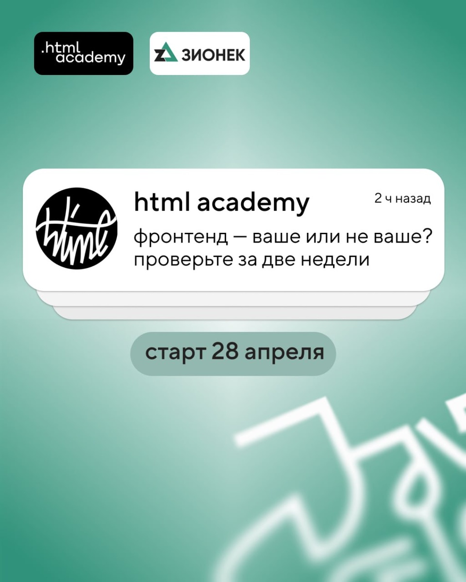 28 апреля стартует группа по программе «Фронтенд-разработчик для компании Зионек». На этот набор мы даём две недели пробного периода — чтобы вы проверили профессию на практике, ничем не рискуя. Как это работает? Бронируете место за 15 000 ₽ и учитесь как все. За две недели успеете сделать первые задачи и поработать с наставником. Этого хватит, чтобы понять — ваше это или не ваше. 💡 Если подошло — продолжаете программу. Впереди месяцы обучения и проекты в портфолио, а на выходе — возможность поработать в компании Зионек. 📎 Если нет — ваши 15 000 ₽ не сгорают. Переведём вас на программу «Верстальщик»: курсы по фундаментальной вёрстке и адаптивной вёрстке, наставник в общем чате. Записаться в Телеграме Записаться через MAX