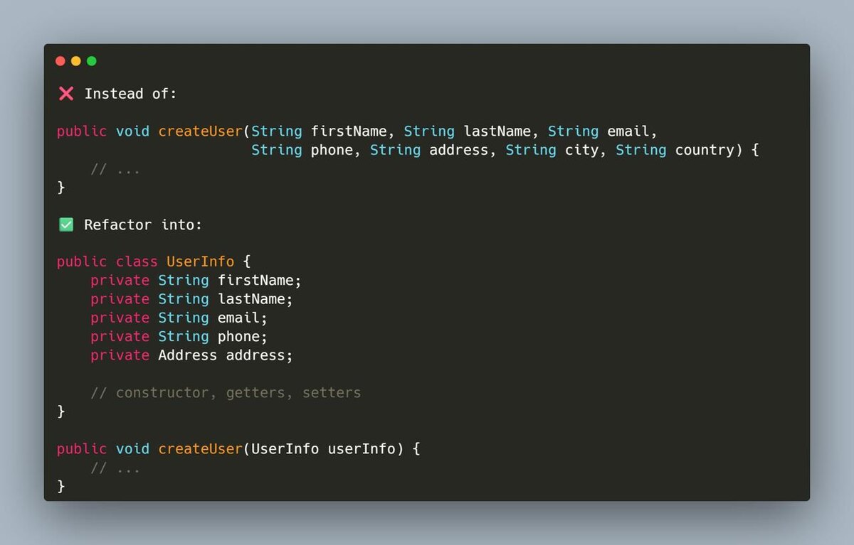Если сигнатура выглядит как: createUser(firstName, lastName, email, phone, address, city, country) Это уже сигнал, что модель данных развалилась. Проблема не только в читаемости. Такие методы сложнее поддерживать, расширять и тестировать. Любое изменение ломает сигнатуру и тянет за собой каскад правок. Нормальный вариант - собрать связанные данные в объект: UserInfo userInfo Получаем: - чище API - проще добавлять поля - меньше ошибок при передаче параметров - код начинает отражать доменную модель, а не список строк Это базовый приём, но именно на нём чаще всего экономят, а потом платят сложностью.