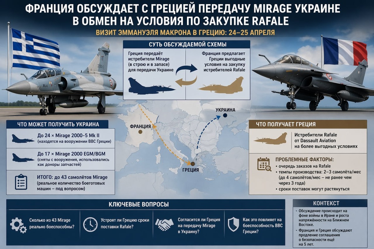 В преддверии визита Эммануэля Макрона в Грецию 24–25 апреля в греческих СМИ появилась информация о том, что в рамках переговоров по продлению двустороннего соглашения в сфере безопасности может обсуждаться схема, при которой Афины передадут имеющиеся у них истребители Mirage французской стороне с последующей их отправкой Украине, а взамен получат более выгодные условия на закупку Rafale. По имеющимся данным, речь может идти о всем парке Mirage, находящемся как в строю, так и в запасе. Формально это выглядит как элемент двустороннего военно-технического взаимодействия между Парижем и Афинами, однако фактически вопрос упирается в возможность использования греческого авиационного ресурса для дальнейшего наращивания поддержки Киева. Потенциально в такой схеме фигурируют до 24 истребителей Mirage 2000-5 Mk II и до 17 самолетов Mirage 2000 EGM/BGM, то есть в общей сложности до 43 машин. При этом принципиальное значение имеет не номинальная численность, а реальное техническое состояние этог