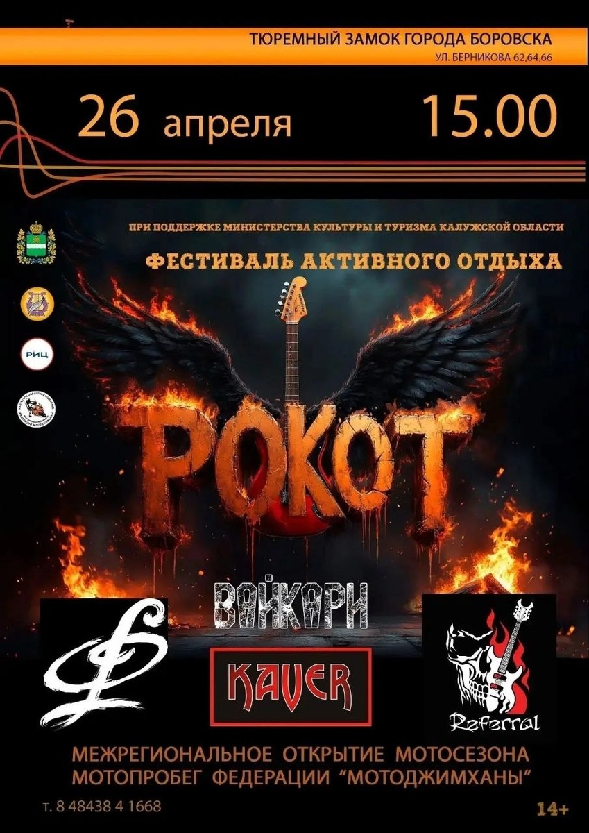 территории 🏰 Тюремного замка! 💥🎸 Вас ждет: -выступления популярных рок-групп Калужской и Московской областей, а именно: 🤘KaVeR 🤘ВАЙКАРИ 🤘Referral 🤘ФлакОН FlacON -выступление коллективов и солистов Боровского округа -ОТКРЫТИЕ межрегионального МОТОСЕЗОНА с участием МотоДжимхана Калужской области 🏍 🤘📌 Вход на фестиваль бесплатный!🆓