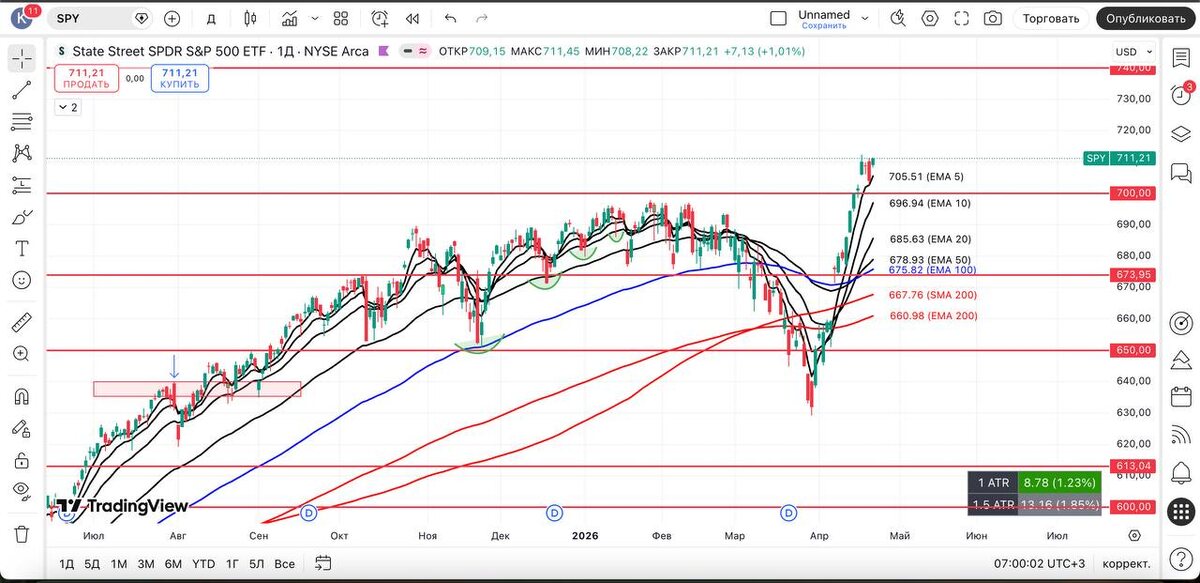 Видим продолжение силы у $QQQ и $SMH, тем самым они тянут $SPY, а широта снижается = зная, что по 5 EMA D происходит самый быстрый «бычий» моментум, не удивимся продолжению движения вверх. И также не удивимся красным дням и пулбэку, учитывая параболическое движение и отдаление от скользящих. #spy #технический_анализ #америка #трейдинг_сша #фондовый_рынок #обзор #вывод #qqq #vix #smh #mags #xlk #ixic