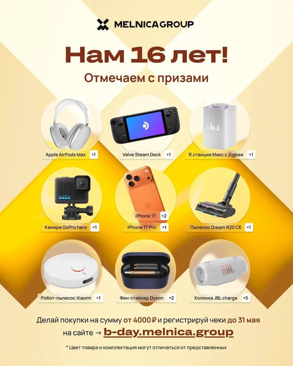 !🎉 Нам 16 лет - Вам подарки!🎁 Запускаем большой розыгрыш с крутыми призами: iPhone 17 и 17 Pro, Dyson Airwrap, JBL, Steam Deck, техника для дома и многое другое 🔥 Итоги розыгрыша 12 июня в прям эфире , желаем удачи!🍀 Полные условия участия в розыгрыше и порядок получения призов: https://melnica-group.ru/prize ВКонтакте МАХ #реклама #3