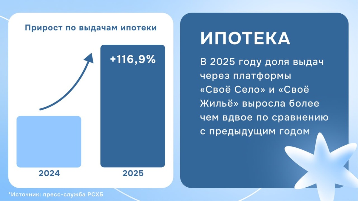 Доля цифровой ипотеки в РСХБ за год выросла вдвое В 2025 году прирост по заявкам составил 47,4%, по выдачам — 116,9%, т.е. более чем вдвое. «Наша философия проста: ипотека должна быть максимально комфортной. Рост доли цифровой ипотеки вдвое — закономерный итог нашего подхода к цифровизации процесса», — отмечает заместитель Председателя Правления Россельхозбанка Елена Батурова. Читайте подробнее в пресс-релизе на платформе Своё Жильё.