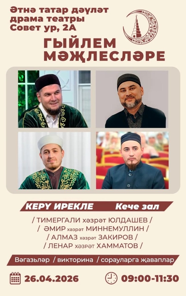 ! Очередная встреча хазратов с населением пройдет в Атнинском районе. Мероприятие организуется отделом дагвата (просвещения) Муфтията Татарстана. 📅Дата: 26 апреля (воскресенье). 📍Место: село Большая Атня, здание Драматического театра, ул. Советская 2А ⏰Время: 9:00-12:00. ❗️В рамках встречи представители ДУМ РТ расскажут мусульманам как достичь успеха в обоих мирах, как правильно распоряжаться самым ценным ресурсом – временем: поделятся своими лайфхаками. Заодно вы сможете принять участие в интересных викторинах: проверить свои знания по основам ислама и получить подарки 🎤В числе спикеров – имам-мухтасиб Арского района Эмир хазрат Миннемуллин, начальник отдела дагвата (просвещения) Муфтията РТ Ленар хазрат Хамматов, помощник имам-хатыйба мечети "Ислам" Алмаз Закиров и имам-хатыйб мечети «Салях» Казани Тимергали хазрат Юлдашев 🗓️Приходите на интересную и полезную встречу со своими родными и близкими! Наш канал в МАХ: max.ru/dumrt