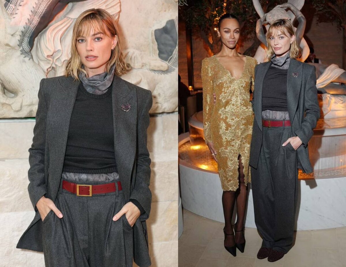 На открытии флагмана RH Milan, The Gallery на Corso Venezia Марго Робби появилась в образе из коллекции Giorgio Armani осень 2026, дебютировавшей на подиуме в марте в рамках Недели моды в Милане. Не в платье, не в вечернем ансамбле: пиджак с широкими плечами, объёмные серые брюки, бордовый ремень, маленькая брошь и тщательно выстроенная многослойность. Для актрисы, которую последние месяцы видели исключительно в нарядах в духе голливудского классицизма, это было неожиданно. Стилист Эндрю Мукамал взял открывающий образ показа: оверсайз-костюм в нескольких оттенках серого. Полупрозрачная блузка с принтом и водолазкой составила первый слой, следом добавился облегающий жилет потёмнее, а финальным штрихом стали пиджак и широкие брюки в тон. На лацкане, вместо подиумного украшения в форме льва, появилась брошь в виде краба. Силуэт делает основную работу: широкие плечи, смягчённая талия, брюки с низкой посадкой. Всё вместе создаёт ощущение абсолютной, почти мужской раскованности. Бордовый р