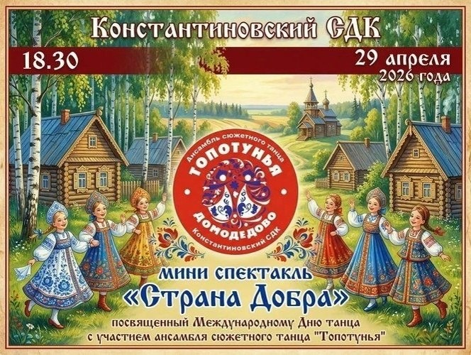 ✨ ✨ Приглашаем на яркое событие этой весны! 🌿 Вас ждёт красочное театрализованное представление с участием ансамбля сюжетного танца «Топотунья». Это история, наполненная добротой, народными традициями и живой энергией танца, которая будет интересна и детям, и взрослым. 🎭 В программе: — народные и сюжетные танцы — яркие костюмы и постановки — тёплая атмосфера праздника 📆 29.04.2026🕒18:30 🏢 Константиновский сельский дом культуры (СДК) 📍 г.о.Домодедово, пос.Государственного племенного завода Константиново, ул.Гагарина, д.1А ✅ Мероприятия Домодедово https://dzen.ru/id/66f10385cc4c5a16f7b5fb02 https://vk.ru/domodedovo_events http://dzen.ru/domodedovo_events