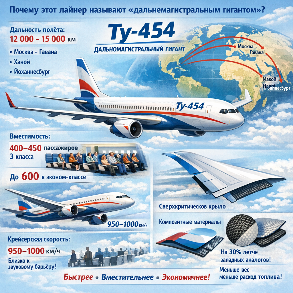Главный козырь — сверхкритическое крыло и композитные материалы. Ту-454 будет примерно на 30% легче, чем любой западный аналог того же размера. Меньше вес — меньше топлива — дешевле билет.