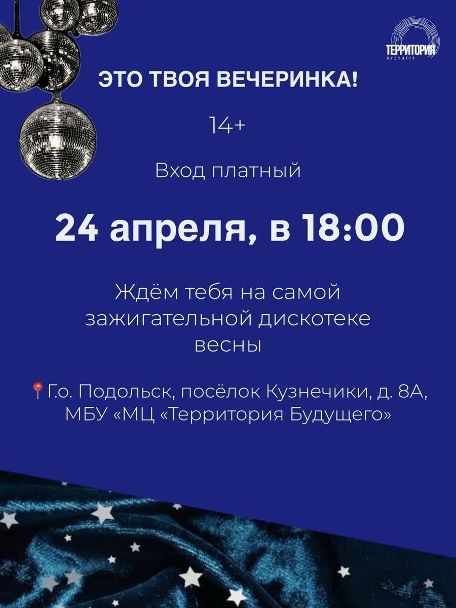 ✨ Интерактивная дискотека (14+) 🚨В вечерней программе: массовые танцы, баттлы, конкурсы, подарки — и это лишь малая часть того, что запланировано. 🎟 Оплата 200 рублей наличными перед мероприятием 🔗 Регистрация: https://forms.yandex.ru/u/69d75c4c95add543e5467433 Бери с собой друзей🔥 🚫 Возраст: 14+ 📆 24.04.2026 🕒 18:00 🏢 Молодёжный центр "Территория Будущего" 📍 г. Подольск, п. Кузнечики, 8а 💰 Цена: 200 ₽ ⭐Поддержать канал голосом 🍰Где поесть в Подольске ✅ Мероприятия Подольск https://dzen.ru/id/66ed500f7b5671493eca3fd6 https://vk.ru/podolsk_events http://dzen.ru/podolsk_events