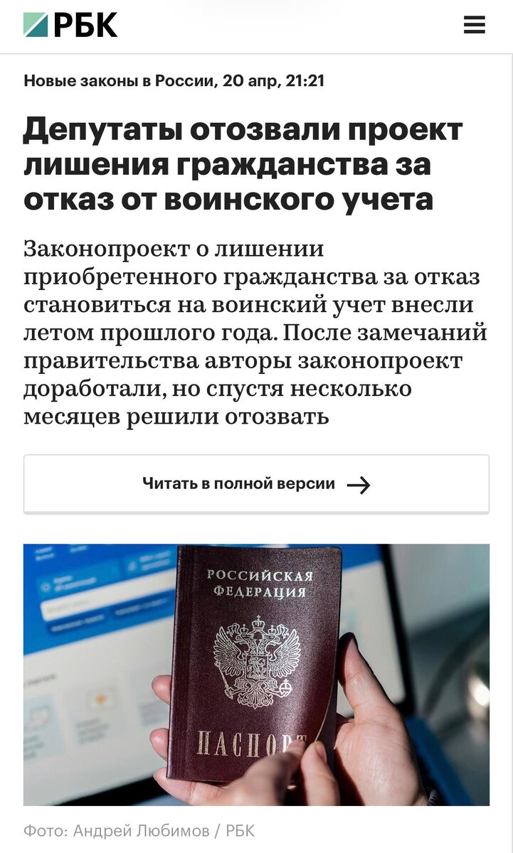 «Эксперты» в соседних тг-каналах решили особо не вчитываться. Написали, что теперь за неисполнение обязанностей по постановке на воинский учёт новоиспечённых граждан РФ гражданства лишать не будут. Будут, друзья. Ничего в законе не изменилось. Ст. 22 138-ФЗ продолжает своё действие, пп. в) п. 1 ст. 22 всё ещё гласит, что гражданство РФ прекращается из-за неисполнения обязанности по постановке на воинский учёт. Законопроект, который недавно отозвали, предлагал усовершенствовать и чётко регламентировать процедуру лишения гражданства по этому основанию, потому что сейчас единого федерального порядка нет и регламентируется она внутренними приказами МВД. Для нас с вами отзыв этого законопроекта ничего не меняет. Гражданства уже лишают за непостановку на учёт. И будут лишать. Практика есть. Будьте внимательны.