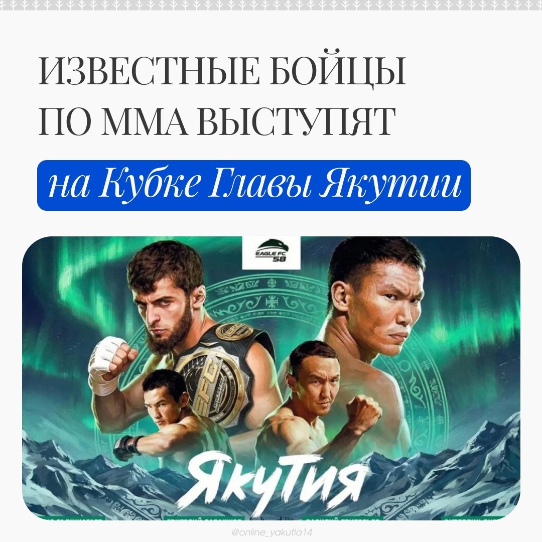 В ЦСП «Триумф» в Якутске 26 апреля состоится третий международный турнир по профессиональному смешанному боевому единоборству (ММА) Eagle FC 53 — Кубок Ил Дархана Якутии Айсена Николаева. Зрителей ждут 11 поединков. Турнир организован совместно с лигой Хабиба Нурмагомедова Eagle FC и лигой профессиональных боев Nord League. Среди бойцов — известные спортсмены, в том числе чемпион России и мира по боевому самбо, обладатель пояса EAGLE FC Исраил Гаджиагаев. Также выступят воспитанники школы единоборств имени Абдулманапа Нурмагомедова, основателями которой являются тренер и его сын, экс-чемпион UFC Хабиб Нурмагомедов. Исраил Гаджиагаев будет защищать титул чемпиона EAGLE FC. За Кубок главы Якутии поборется воспитанник клуба Sakha wrestling MMA Октябрин Яковлев (весовая категория 61 кг). Кроме этого, в основных поединках выступят якутяне Григорий Барашков (70 кг) и Василий Григорьев (66 кг). источник: ЯСИА Online Якутия | Ждем вас в МАХ