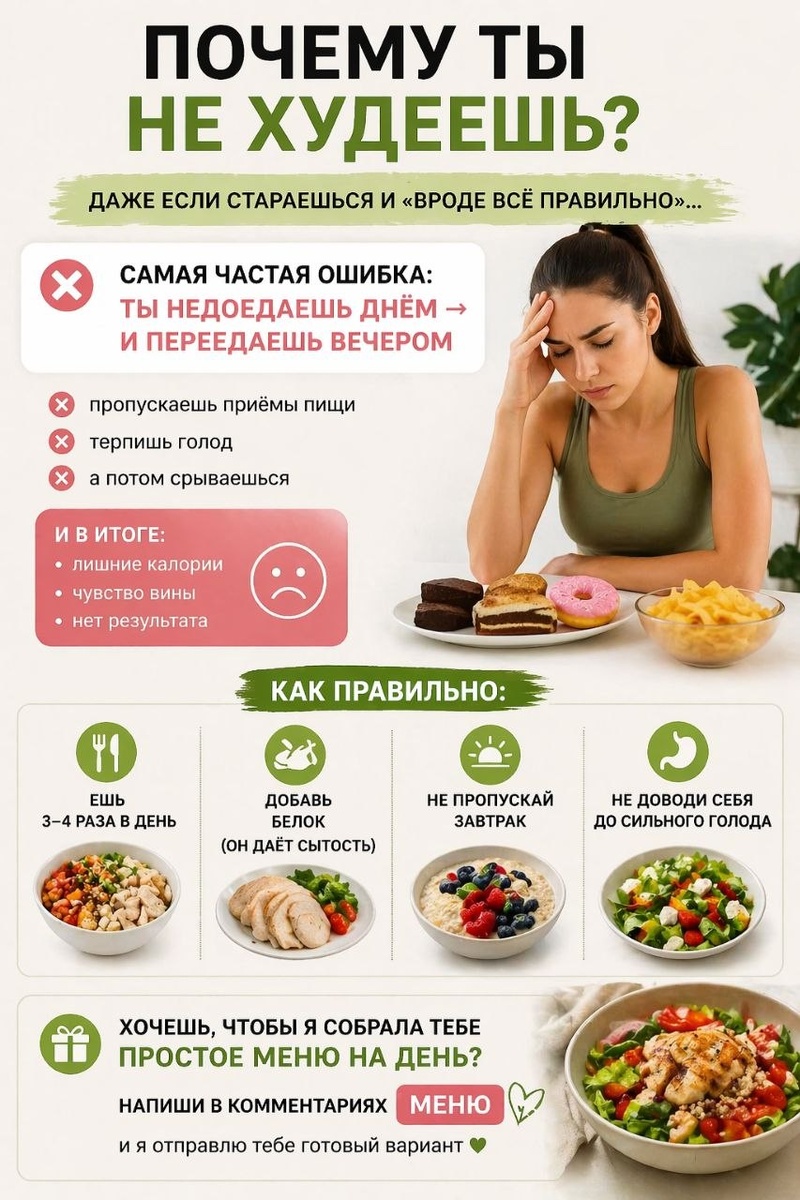 ? Даже если стараешься и “вроде всё правильно”… Вот самая частая ошибка 👇 Ты недоедаешь днём → и переедаешь вечером 👉 пропускаешь приёмы пищи 👉 терпишь голод 👉 а потом срываешься И в итоге: ❌ лишние калории ❌ чувство вины ❌ нет результата --- 💡 Как правильно: ✔ ешь 3–4 раза в день ✔ добавь белок (он даёт сытость) ✔ не пропускай завтрак ✔ не доводи себя до сильного голода --- Хочешь, чтобы я собрала тебе простое меню на день? Напиши в комментариях МЕНЮ 💚 и я отправлю тебе готовый вариант