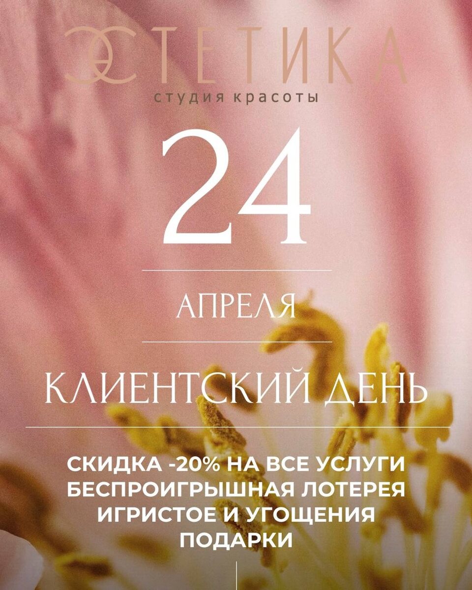 🕊️ УЖЕ ЗАВТРА, 24 АПРЕЛЯ, мы встретимся с вами в студии «ЭСТЕТИКА» и проведем клиентский день