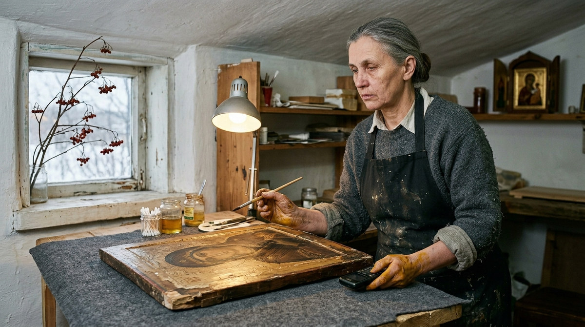Мастерская сидела в бывшей сторожке при храме Параскевы Пятницы. Две комнаты, низкие потолки, запах льняного масла въелся в стены так, что даже отец Александр, заходя, принюхивался. Двор за окном – старая рябина, в которую каждую осень прилетали дрозды и объедали ягоды за три дня. Валентина реставрировала иконы всю жизнь. Училась ещё в Строгановке, в конце восьмидесятых, потом работала в музее, потом ушла на приход, когда музей закрывался. Руки у неё были как у музыканта – сухие, длинные, с коротко стриженными ногтями, всегда в мелких порезах от скальпеля.