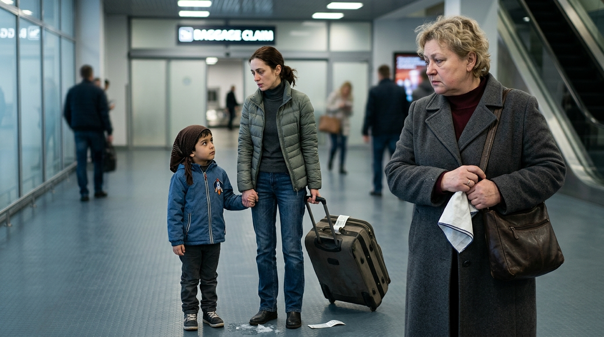 Оля шла медленно, с большим потёртым чемоданом на колёсиках. На ней была серо-зелёная куртка, которую Нина не узнавала. Волосы убраны в хвост, без укладки. А за руку она держала мальчика. Лет шести, в курточке на молнии, с большими карими глазами, с тёмным платком, повязанным на голову по-домашнему, как повязывают платок на ночь, чтобы волосы не путались.