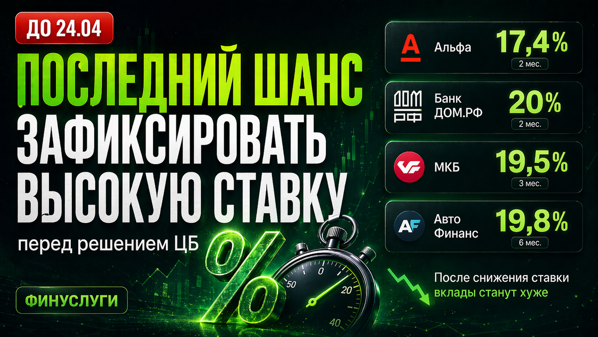⚡️ СРОЧНО: Последняя возможность, чтобы зафиксировать высокую ставку! 24 апреля, Банк России решает по ключевой ставке. Рынок закладывает снижение с 15% до 14,5-14%. Перевожу на человеческий: после решения банки сразу начнут резать доходность по новым вкладам. То, что сегодня выглядит как норма, на следующей неделе будет казаться подарком судьбы. ⚠️ Пока окно открыто, фиксируем проценты. Самые жирные варианты на Финуслугах (маркетплейс МосБиржи): Альфа-Вклад «Капитал» - 17,4% годовых. • Срок: 2 месяца (идеально под снижение ставки). • На 100 000 ₽: ~2 900 ₽ чистой прибыли (проценты + бонус). • Промокод BONUS55 даёт +5,5% (до 4 000 ₽) на первый вклад. ➡️ https://agents.finuslugi.ru/go?erid=2W5zFHKMENk Банк ДОМ .РФ «Надёжный Старт» - 20% (2 мес), без бонусных сложностей. Чистая ставка, ничего не нужно считать. МКБ «Преимущество+» - 19,5% (3 мес) или 18,9% (12 мес) с бонусом. Для тех, кто хочет чуть больше времени. Авто Финанс Банк «Конвейер дохода» - 19,8% (6 мес). В ТОП-30 по активам, н