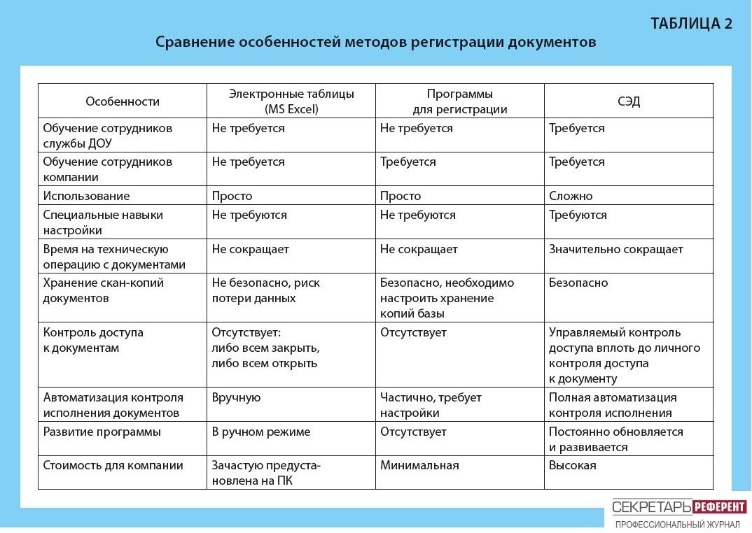 в организации. В процессе регистрации письмо или документ помещают в базу данных, присваивают ему регистрационный индекс и указывают дату его поступления или подписания (утверждения). ❓Как службе документационного обеспечения управления регистрировать корреспонденцию и документы, если в организации нет внедренного электронного документооборота? Возможны три метода: электронные таблицы (MS Excel), программы для регистрации, СЭД. ❗️Чтобы определиться, каким методом регистрировать документы в организации, сведем их ключевые преимущества и недостатки в Таблицу.