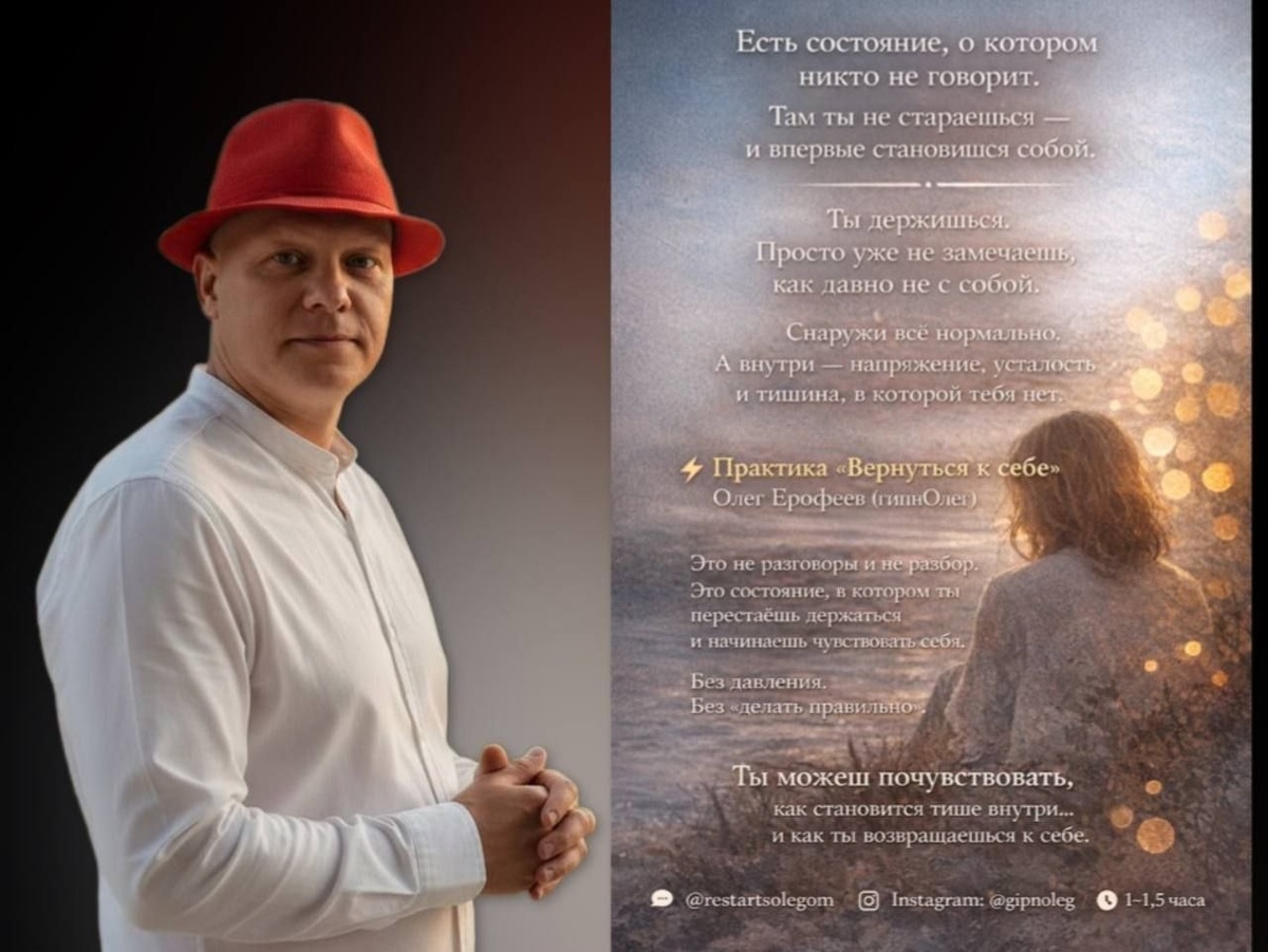 💕💕💕💕😉💕💕 👌💕💕💕 💕💕💕 Олег Ерофеев (гипнОлег) Сертифицированный мастер-гипнотерапевт (IAH, London) и студент МИП. Объединяю западные техники работы с подсознанием и научный подход. Практика «Вернуться к себе» Это не обсуждение и не разбор. Это состояние, в котором вы перестаете «держаться» и начинаете чувствовать себя. Без давления и правил «как надо». Результат: • Внутренняя тишина. • Глубокий контакт с собой. • Настоящее освобождение от напряжения. Только для тех, кто готов к честной встрече с собой. 📩 Связь и запись: Telegram: @restartsolegom | Запись на консультацию (ассистент):@IRAerof Instagram: https://www.instagram.com/gipnoleg?igsh=Zmh0Ymg0YW5mbXcx 🎫 БИЛЕТЫ Наши события (10% -за рекомендацию друзьям) 🌍26-28 июня. Тур в Питер. Белые ночи 🌍15-22 июня. Мальдивы. 🌍27 июл. по 02 авг. Тур - ретрит. Сочи. (Скоро подробности) 🌍Сайт и соц сети