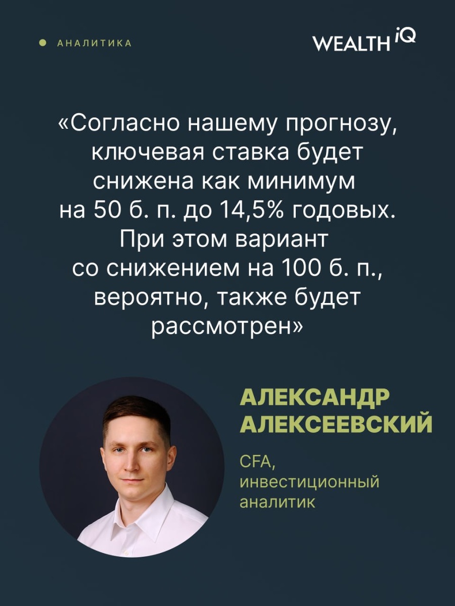 Какое решение примет регулятор? 💬 Александр Алексеевский, инвестиционный аналитик Wealth iQ, CFA Согласно нашему прогнозу, ключевая ставка будет снижена как минимум на 50 б. п. до 14,5% годовых. При этом вариант со снижением на 100 б. п., вероятно, также будет рассмотрен. ⁉️ Что с последними макроэкономическими данными? Согласно оценке Банка России, по сравнению с февралем базовая инфляция (без учета волатильных компонентов) с устранением сезонности и в пересчете на год (с. к. г) в марте не изменилась и составила 4,8%. По заявлению регулятора, показатели устойчивой инфляции несколько повысились, оставаясь преимущественно в диапазоне 4-5% (с. к. г.). Банк России также сообщил, что ожидаемая населением инфляция в следующие 12 месяцев в апреле снизилась до 12,9% с 13,4% в марте. Наряду с этим инфляция, ожидаемая предприятиями в следующие три месяца (в годовом выражении), в апреле уменьшилась до 4,7% с 4,9% в марте. В свою очередь, данные Росстата указывают на практически нулевой при