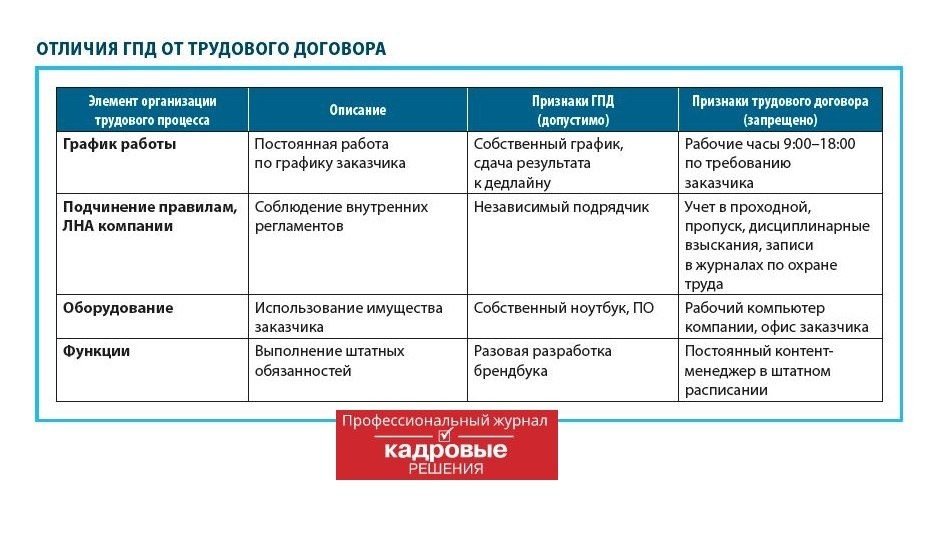 Основные отличия ГПД и трудового договора мы показали в таблице.