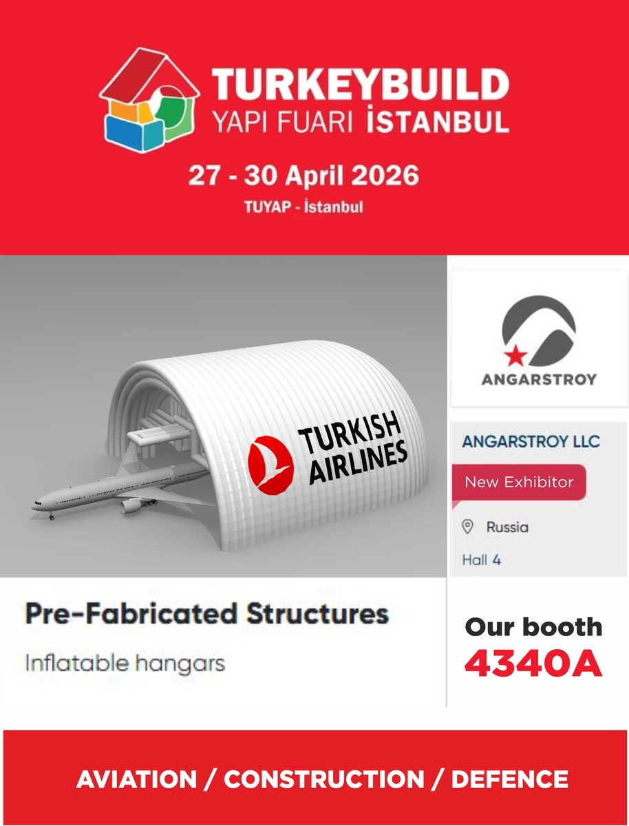 Ангарстрой принимает участие в выставке Turkeybuild Istanbul 2026! Делимся с Вами новыми решениями для нужд авиации, строительства и обороны. Добро пожаловать на наш стенд! 📍 Yapi Turkeybuild Istanbul 2026 📅 27–30 апреля 🖥 Павильон 4, стенд 4340 (Tüyap Fair and Congress Center) Надувные ангары, пневмоангары для Турции!