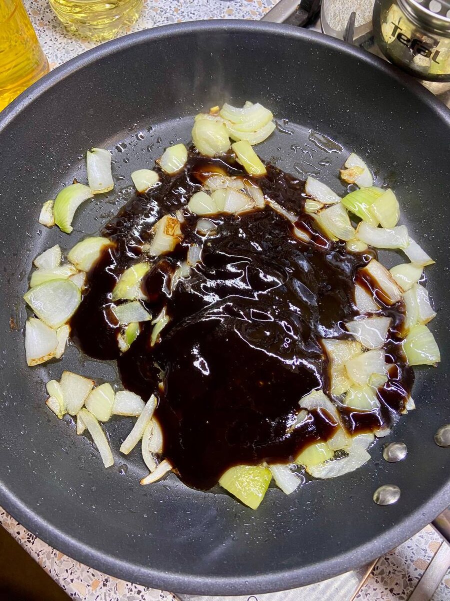 Не бывает так, чтобы гости "вдруг" оказались на пороге. Я часто слышу такое замечание от читателей. Но, представьте себе, быввает. Когда у тебя много знакомых, кто-нибудь да проезжает мимо, позвонив буквально за полчаса. Это время я обычно трачу на то, чтобы завершить свои рабочие дела, а не на то, чтобы стоять у плиты. Вот один из моих любимых рецептов - пятиминуток, который оценили наши друзья, когда заехали в гости небольшой компанией. Для этого рецепта у меня дома есть всё. Но начало банальное - обжариваем репчатый лук на растительном масле. Одновременно ставим варить удон (можно залить кипятком фунчёзу). В любом случае, соус готовится очень быстро. Добавляем к обжаренному луку примерно 100 мл готового соуса терияки (он продаётся везде, хранится долго, поэтому беру в запас сразу несколько дойпаков). Когда соус прогреется и начнёт закипать, закидываем то, что есть - у меня было 200 г морского коктейля. Вместо гадов можно добавить крабовые палочки, консервированный тунец, или вообще