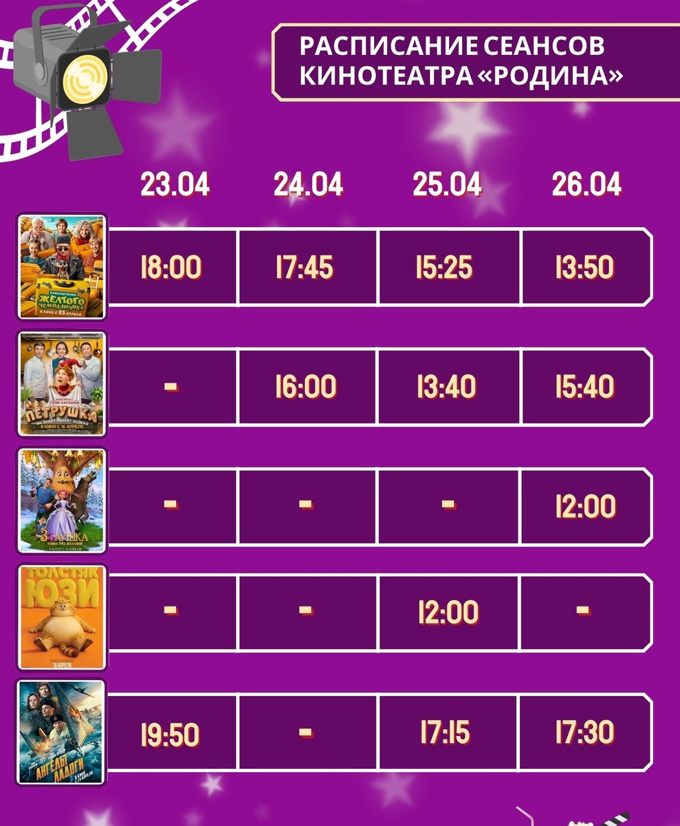 Мы подготовили для вас актуальное расписание сеансов кинотеатра "Родина", чтобы вы могли выбрать фильм по душе и провести вечер выходного
