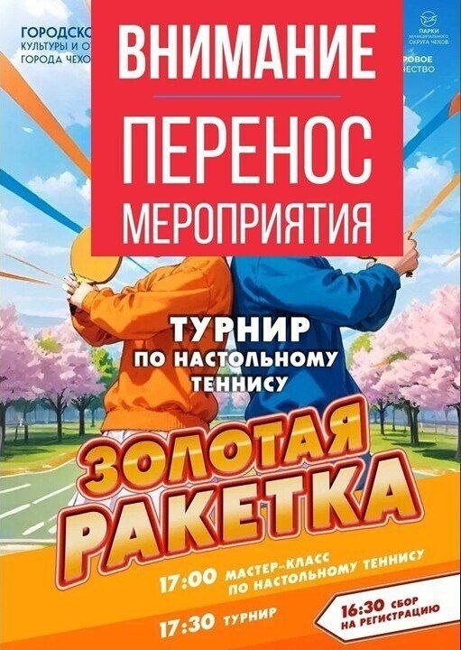 В Чехове перенос запланированного мероприятия! К сожалению, в связи с неблагоприятными погодными условиями, запланированный на сегодняшний день фестиваль по настольную теннису под названием "Золотая ракетка", который должен был пройти в Городском парке культуры и отдыха переносится на 28 апреля (вторник) с сохранением времени! "Чеховчанка-инфо" в ВК ▶️ подпишись