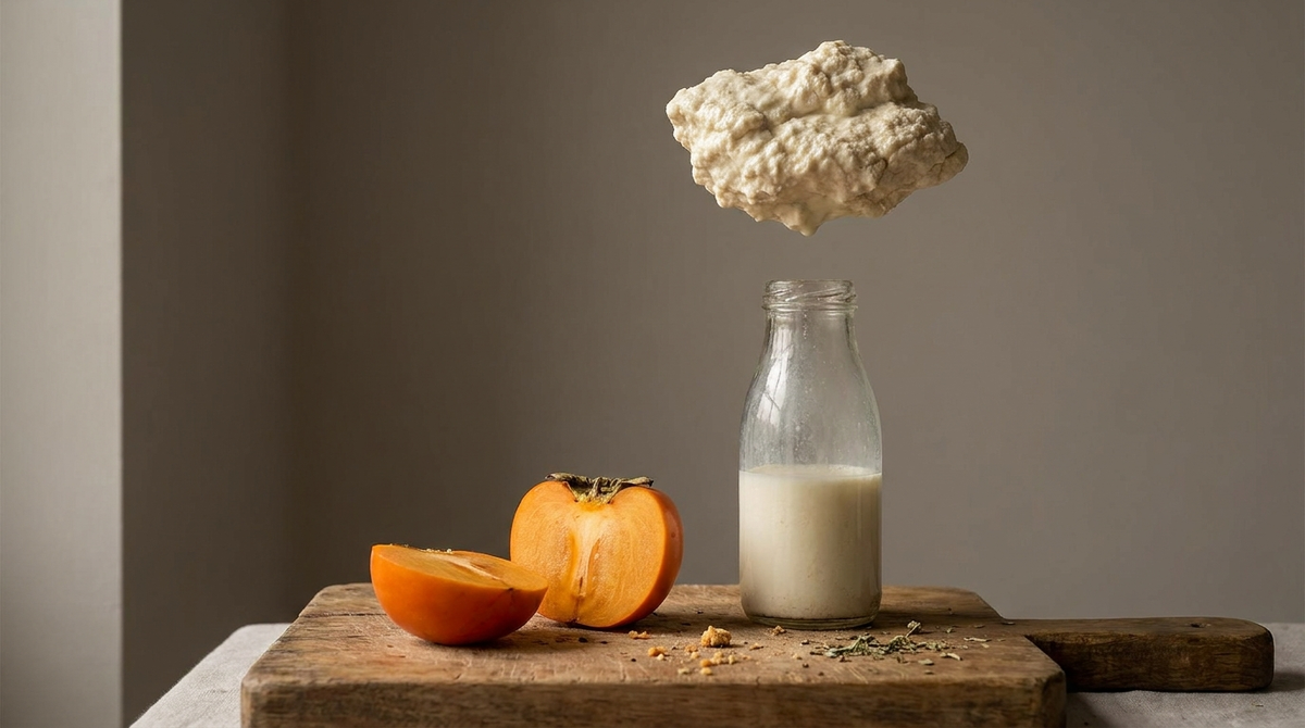 Танины из хурмы встречаются с молочным белком. Желудочный сок пытается их расщепить - но не может. Связь слишком прочная. И образуется плотный, резиноподобный ком.