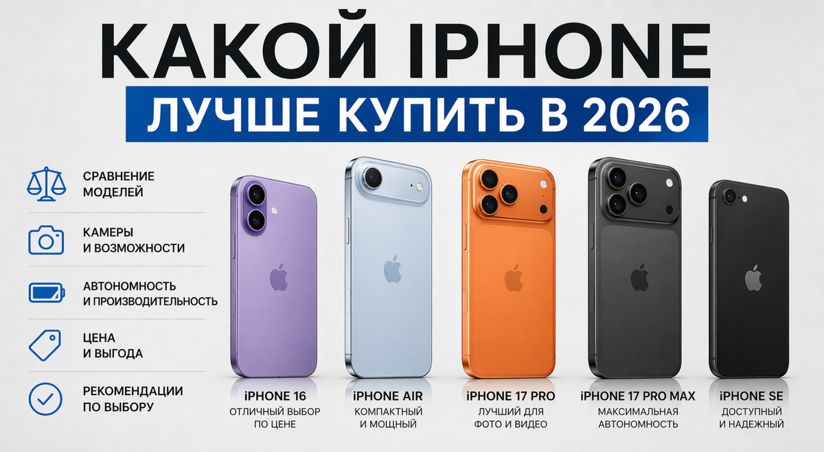 Выбор iPhone в 2026 году зависит прежде всего от вашего бюджета, сценариев использования и требований к камере, автономности и производительности. Для большинства пользователей оптимальным решением станет iPhone 17. Тем, кто ищет более компактное устройство, подойдёт iPhone Air. Pro-версии стоит рассматривать тем, кто активно снимает фото и видео и хочет получить максимум возможностей. Если главная задача — сэкономить, разумно обратить внимание на iPhone SE или восстановленные модели прошлых поколений.