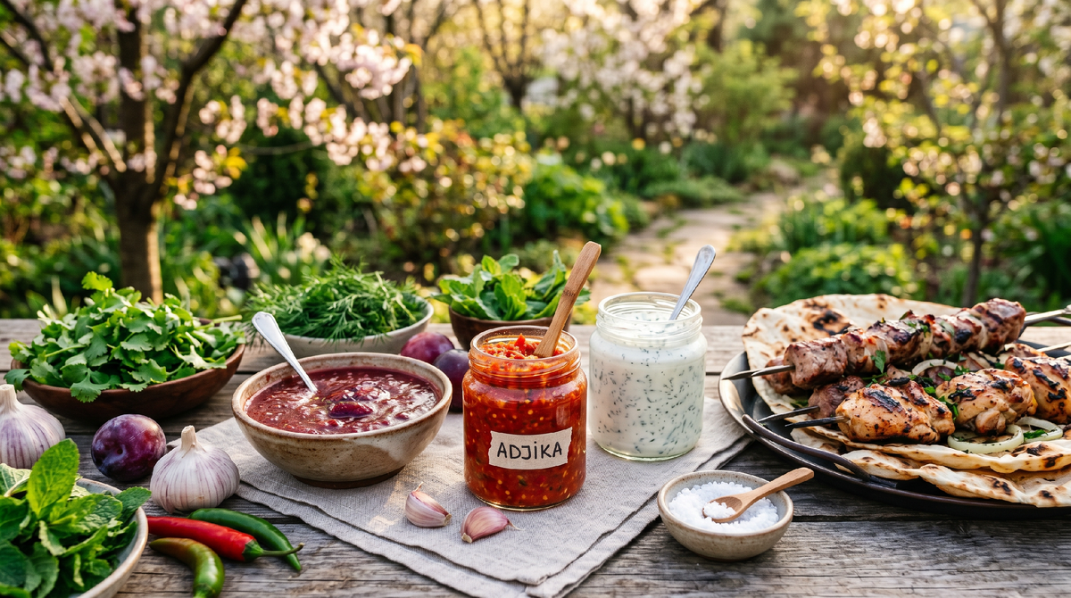 Первая — кислый соус с фруктовой ноткой, который освежает и оттеняет жирное мясо. Это ткемали. Вторая — острый и яркий соус, который бьёт по вкусовым рецепторам и заставляет есть ещё и ещё. Это аджика. И третья — простой сливочный чесночный соус, который любят вообще все, включая детей и тех, кто острое не переносит на дух. Вот эта тройка закрывает абсолютно любой стол. Хоть шашлык из свинины, хоть курица на решётке, хоть овощи гриль, хоть просто хлеб — ко всему найдётся подходящая пара.