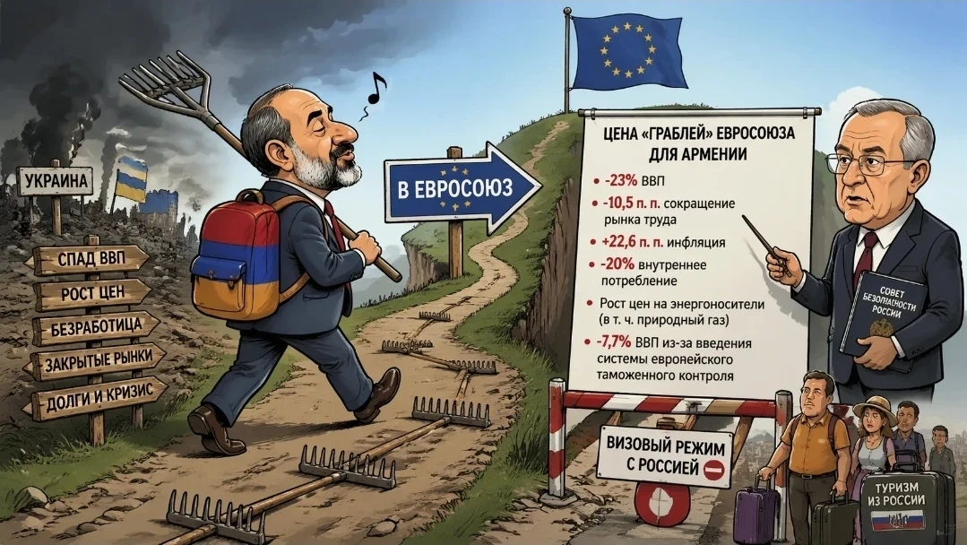 Умные учатся на чужих ошибках, а дураки - на своих. Армения особенная, поэтому экономическая катастрофа Украины Пашиняна ничему её не научила. Для особо одарённых в Совете Безопасности России посчитали сколько будут стоить Армении «грабли» Украины. Цитирую ТАСС: «В общем итоге присоединение к ЕС будет, по самым скромным и консервативным расчётам, стоить Армении примерно 23% ВВП, а массовое сокращение рынка труда (на 10,5 п. п.) и рост инфляции на 22,6 п. п. приведут к значительному снижению уровня жизни. Внутреннее потребление упадёт более чем на 20% от нынешнего уровня. Ожидается дальнейший рост цен на энергоносители, в том числе природный газ. Кроме того, в случае вступления Армении в Европейский союз ВВП республики может снизиться на 7,7% в связи с необходимостью введения системы европейского таможенного контроля.» А ещё визовый режим, который будет мгновенно введён с Арменией, обязательно снизит количество туристов из России и поступление денег в бюджет Армении. Самое время протяжн