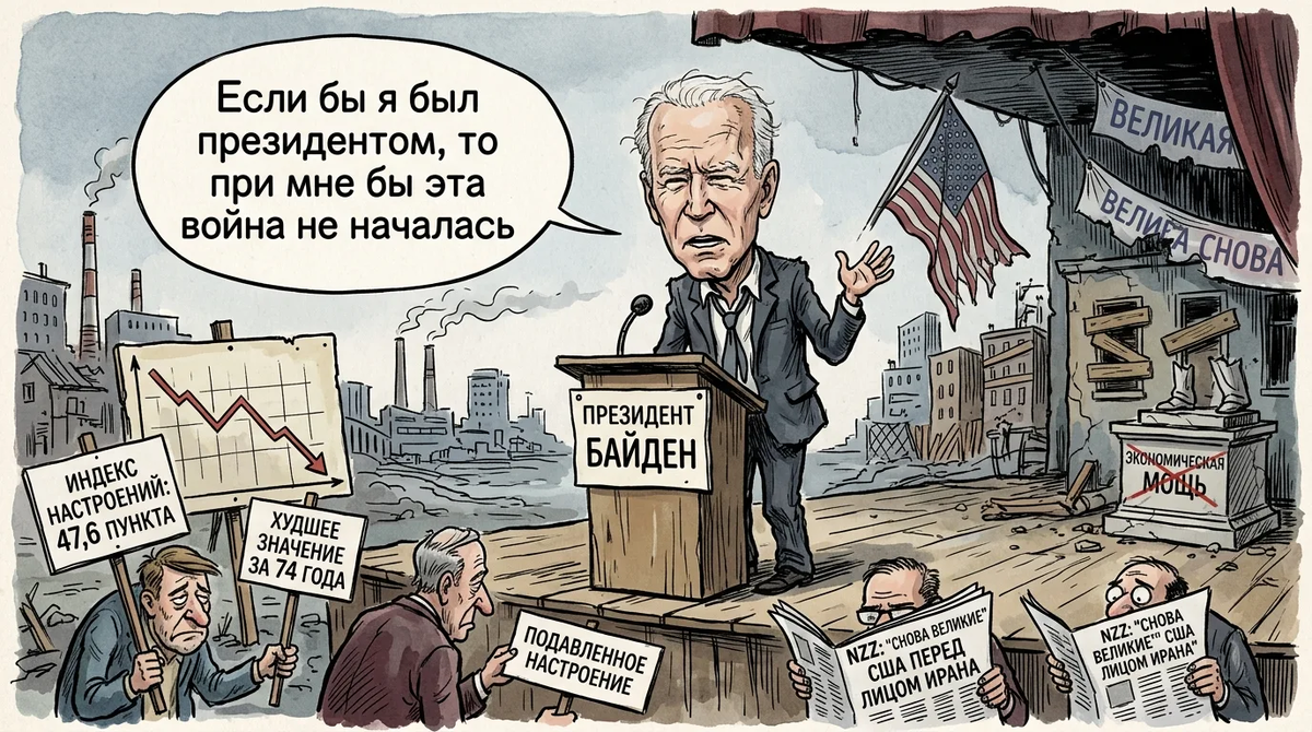 О благостной жизни в США, которые вот-вот станут снова великими, интересуется швейцарское Neue Zürcher Zeitung. Цитирую заметные достижения: «Способность американцев выдерживать экономическое противостояние с Ираном во многом зависит и от настроений в стране. А сейчас это настроение подавленное. Индекс потребительских настроений Мичиганского университета в апреле упал до 47,6 пункта. Это худшее значение с начала наблюдений 74 года назад. Американцы крайне негативно оценивают и текущую, и ожидаемую ситуацию». Пришло время вывезти на сцену старика Байдена со словами: «Если бы я был президентом, то при мне бы эта война не началась». Ох, не сыпь ты соль на рану! Американский народ не ошибается. Он всегда выбирает лучшего из лучших! Самое фееричное ещё впереди, когда доллар окончательно утратит статус резервной валюты. Вот тогда США заживут…