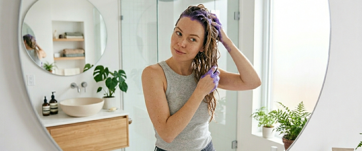Вы наконец добились того самого холодного оттенка блонда, о котором мечтали. Но проходит две недели — и вместо пепельного сияния появляется надоедливая желтизна. Знакомая ситуация? Фиолетовая маска — это мощное оружие в борьбе с желтизной. Но при неправильном использовании она может превратить ваши волосы... в сиреневые. Рассказываем, как пользоваться этим средством без риска для цвета и кошелька. В основе работы лежит цветовой круг. Желтый и фиолетовый — противоположные цвета. Когда фиолетовый пигмент попадает на желтый, они нейтрализуют друг друга . В результате желтизна исчезает, а блонд становится более холодным и чистым. В отличие от фиолетового шампуня, который быстро смывается, маска остается на волосах дольше . Пигмент проникает глубже, а увлажняющие компоненты (масла, пантенол) работают одновременно. Это двойное действие — тонирование + питание — и делает маски такими эффективными . Самая частая причина появления сиреневого оттенка — передерживание. Вместо 5 минут вы оставляет