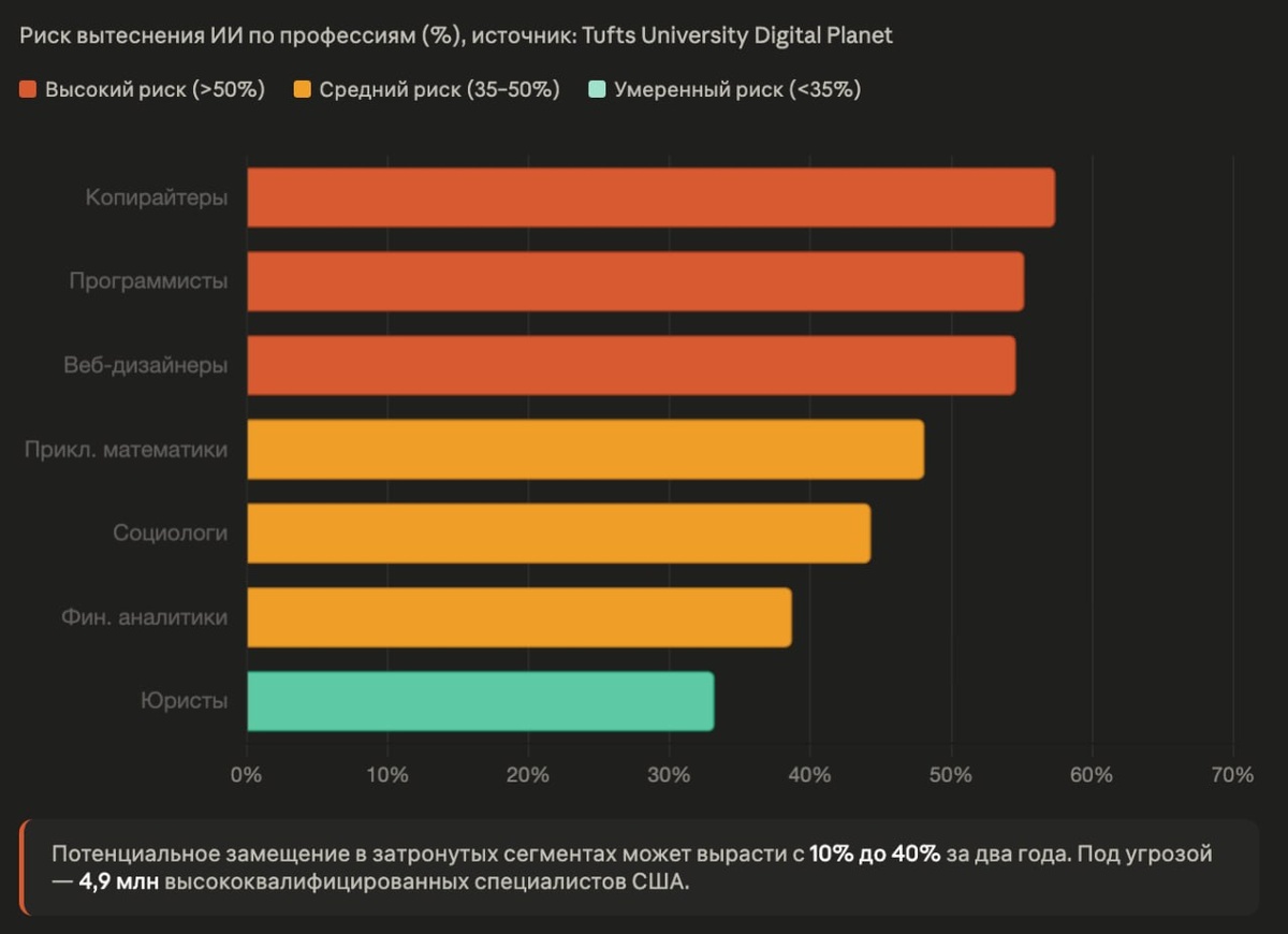 ΠΠ΅Π½Π΅ΡΠ°ΡΠΈΠ²Π½ΡΠΉ ΠΠ ΠΏΠ΅ΡΠ΅ΡΡΠ°Π» ΡΠ³ΡΠΎΠΆΠ°ΡΡ ΡΠΎΠ»ΡΠΊΠΎ Π½ΠΈΠ·ΠΊΠΎΠΊΠ²Π°Π»ΠΈΡΠΈΡΠΈΡΠΎΠ²Π°Π½Π½ΠΎΠΌΡ ΡΡΡΠ΄Ρ β ΠΏΠΎΠ΄ ΡΠ΄Π°Ρ ΠΏΠΎΠΏΠ°Π»ΠΈ ΡΡΠΈΡΡΡ, ΠΏΡΠΎΠ³ΡΠ°ΠΌΠΌΠΈΡΡΡ, Π΄ΠΈΠ·Π°ΠΉΠ½Π΅ΡΡ ΠΈ ΠΊΠΎΠΏΠΈΡΠ°ΠΉΡΠ΅ΡΡ. ΠΠΎ ΠΎΡΠ΅Π½ΠΊΠ°ΠΌ MIT, ΠΠ ΡΠΏΠΎΡΠΎΠ±Π΅Π½ Π²ΡΡΠ΅ΡΠ½ΠΈΡΡ 11,7% ΡΠ°Π±ΠΎΡΠ½ΠΈΠΊΠΎΠ² ΡΡΠ½ΠΊΠ° ΡΡΡΠ΄Π° Π‘Π¨Π, ΡΡΠΎ ΡΠΊΠ²ΠΈΠ²Π°Π»Π΅Π½ΡΠ½ΠΎ $1,2 ΡΡΠ»Π½ ΡΠΎΠ½Π΄Π° ΠΎΠΏΠ»Π°ΡΡ ΡΡΡΠ΄Π° Π² ΡΠΈΠ½Π°Π½ΡΠ°Ρ