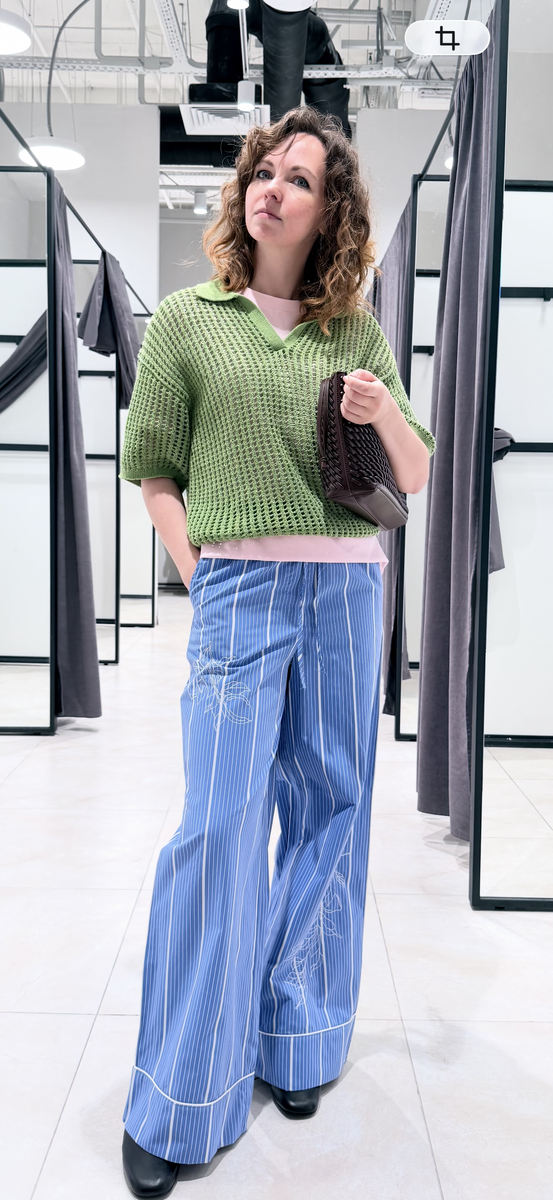 Приветствую вас, дорогие читатели! Сегодня вам покажу как сходили на шопинг с моим постоянным клиентом, девушкой молодой, красивой и смелой. Жаль, что предварительно не провели разбор гардероба, но как говорится, желание клиента - закон. Душа требовала обновок и точка. Какой был запрос. Поскольку девушка сама хорошо ориентируется в модных новинках + имеет природный вкус, запрос был очень вдохновляющим: Что ж, поехали. Образ 1. Строился на брюках в пижамном стиле, очень модных в этом сезоне. К брюкам я добавила не менее модный вязаный джемпер-поло в сочном зеленом цвете, дополнила нежно розовой футболкой. Плетеная сумка в шоколадном цвете отлично бьется по фактуре с поло. На ногах черные мюли с красивым слегка вытянутым и округлым мыском. Чтобы брюки выглядели именно как в пижамном стиле, а не пижамой как таковой, необходимо их сочетать с более собранной обувью: туфли, мюли или слингбеки на небольшом каблучке подойдут. От кед, кроссовок и шлепок лучше воздержаться. Образ 2. Те же брюк