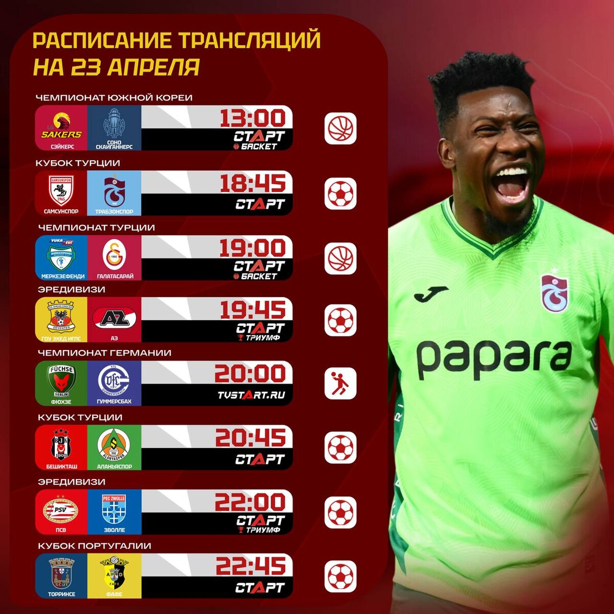 ! ΠΠ°ΠΊ, Π½Π°ΠΏΡΠΈΠΌΠ΅Ρ, ΡΠ΅Π³ΠΎΠ΄Π½Ρ! ΠΠ»Π΅ΠΉ-ΠΎΡΡ ΠΊΠΎΡΠ΅ΠΉΡΠΊΠΎΠ³ΠΎ Π±Π°ΡΠΊΠ΅ΡΠ±ΠΎΠ»Π°, ΡΡΡΠ΅ΡΠΊΠΈΠΉ Π±Π°ΡΠΊΠ΅Ρ ΠΈ Π½Π΅ΠΌΠ΅ΡΠΊΠΈΠΉ Π³Π°Π½Π΄Π±ΠΎΠ»! ΠΠ· ΡΡΡΠ±ΠΎΠ»Π°: ΠΡΠ΅Π΄ΠΈΠ²ΠΈΠ·ΠΈ, ΠΡΠ±ΠΎΠΊ ΠΠΎΡΡΡΠ³Π°Π»ΠΈΠΈ ΠΈ, ΠΊΠΎΠ½Π΅ΡΠ½ΠΎ ΠΆΠ΅, ΠΡΠ±ΠΎΠΊ Π’ΡΡΡΠΈΠΈ! ΠΠΎΠΏΡΠΎΠ±ΡΠ΅ΠΌ ΡΡΠ»Π΅Π΄ΠΈΡΡ Π·Π° Π²ΡΠ΅ΠΌ π€© ΠΠΎΠ΄ΠΏΠΈΡΡΠ²Π°ΠΉΡΡ Π½Π° Π’Π Π‘Π’ΠΠ Π’ Π² MAXπ²