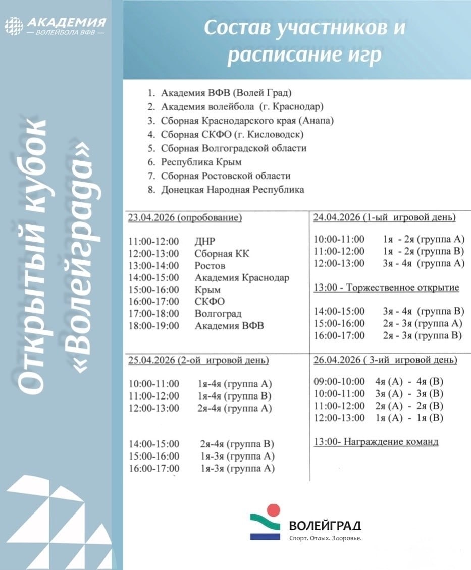 : ⚪️ Академия ВФВ (Волей Град) ⚪️ Академия волейбола (Краснодар) ⚪️ Сборная Краснодарского края (Анапа) ⚪️ Сборная СКФО (Кисловодск) ⚪️ Сборная Волгоградской области ⚪️ Республика Крым ⚪️ Сборная Ростовской области ⚪️ Донецкая Народная Республика 📅 Даты: 23–26 апреля 🎉 Торжественное открытие: 24 апреля в 13:00 🏆 Награждение команд: 26 апреля в 13:00 📍 Где: Волейград, Витязево, пр. Южный, 5 🎟 Вход свободный 📣 Приходите, занимайте лучшие места на трибунах и покажите, как нужно болеть за любимую команду! 🔥
