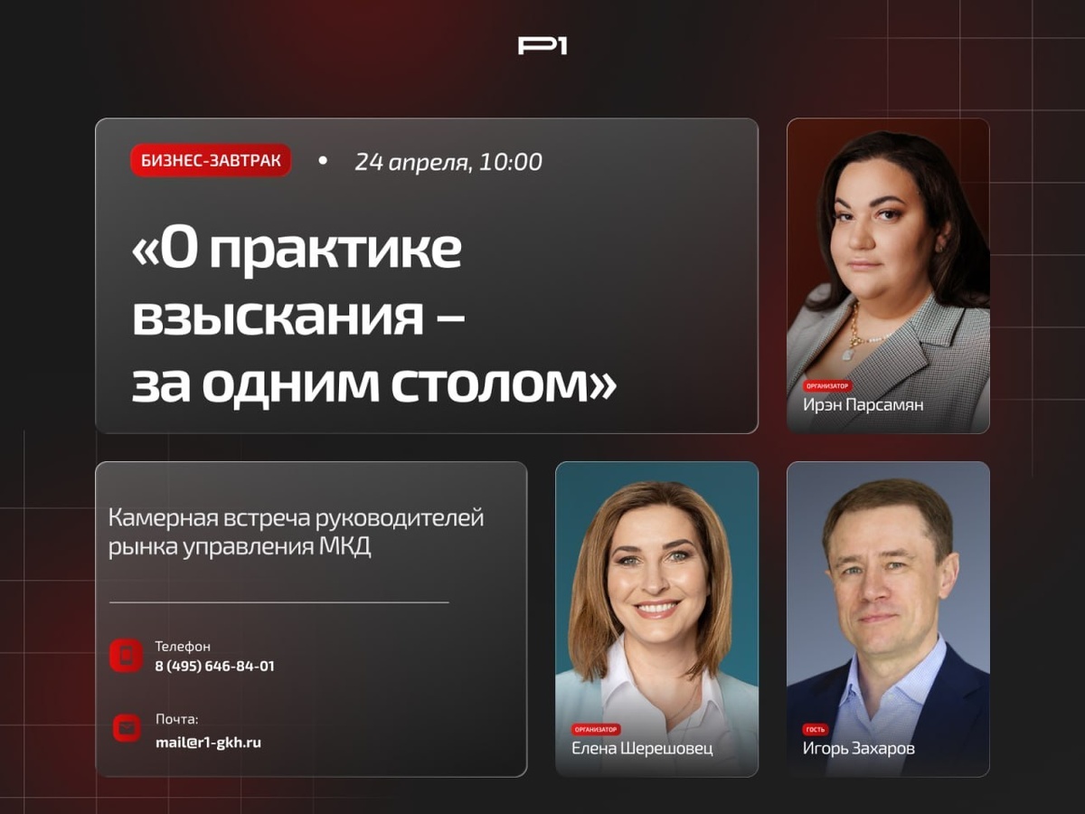 Проблема управляющих организаций не в долгах. Проблема в том, как их взыскивают. Расскажем, как возвращать деньги в бизнес – в формате камерной встречи профессионального сообщества. 📍 24 апреля в Санкт-Петербурге пройдёт бизнес-завтрак Ассоциации «Р1» для руководителей управляющих организаций, посвящённая практике взыскания задолженности в ЖКХ. ✅ Встречу проведут Ирэн Парсамян и Елена Шерешовец. Приглашённый гость – генеральный директор «СКП», эксперт по задолженности в ЖКХ Игорь Захаров. 💸 На бизнес-завтраке разберём: ➡️ как сокращать потери от задолженности на практике ➡️ как выстраивать и усиливать юридическую позицию ➡️ как применять рабочие решения уже сегодня 🕓 Когда: 24 апреля, с 10:00 до 13:00. 📍 Где: ул. Александра Невского, 8а, ресторан «Muse of City». 🩷 Займите последнее место! ➡️ Подробности и регистрация Телеграм | MAX | ВКонтакте