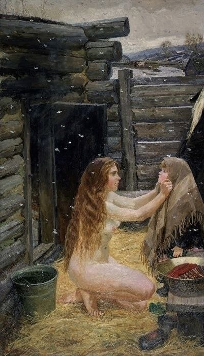 🤩🤩🤩 🤩🤩🤩🤩🤩🤩 Аркадий Александрович Пластов (1893 - 1972) "Весна", 1954 г. Государственная Третьяковская галерея “Весна” - уникальное для советского периода произведение в жанре “ню”. В картине Пластов обращается к идеалу женской красоты, теме, оказавшейся провокационной даже для своего “предоттепельного” времени. Сегодня “Весна” открывает раздел искусства второй половины ХХ века в 28 зале постоянной экспозиции Новой Третьяковки и остаётся одним из самых интересных для интерпретации произведений. На полотне Пластов изображает молодую женщину, колхозницу из своей родной деревни Прислонихи, которая кутает на морозе в открытом предбаннике девочку. Как нередко у Пластова, сцена изображена внутри конкретного пейзажа - заснеженной панорамы деревни, виднеющейся за забором. Холодный по тону, в какой-то степени невзрачный пейзаж соотносится с простотой жилого быта - самой бани, топящейся “по-черному”, без электричества, с минимумом удобств. И хотя очевидная нищета убранства в карти