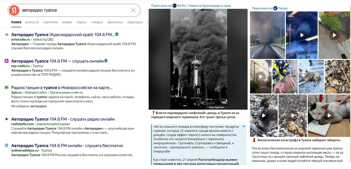 Час назад между делом на сайте, вскользь написали про превышение вредных веществ в воздухе Туапсе на фоне пожара, а глобально - ни-гу-гу... не хотят дружбанам настроение портить - у них же скоро большая пьянка в Сочи, зря что ли эскорт-агентства обзванивали, дешёвое пойло бартерное заказывали в промышленных масштабах, и... ну, этсамое… "Давайте поможем Даше найти" информацию в сети: В 80 километрах от планируемой пьянки-гулянки: ❗️Власти подтвердили «нефтяной» дождь в Туапсе из-за горящего морского терминала. Его тушат третьи сутки. «Из-за сильного пожара в атмосферу поступают продукты горения, которые 22 апреля в городе выпали вместе с дождём, создав эффект черного налета на поверхностях. Экологическая катастрофа в Туапсе набирает обороты Воздух сильно отравлен — замеры показали, что содержание бензола, ксилола и сажи превышено в 2-3 раза. Хуже всего пришлось бродячим животным — почти все они покрыты мазутом и травятся этой дрянью, волонтёры бьют тревогу. При этом горожане жалуют