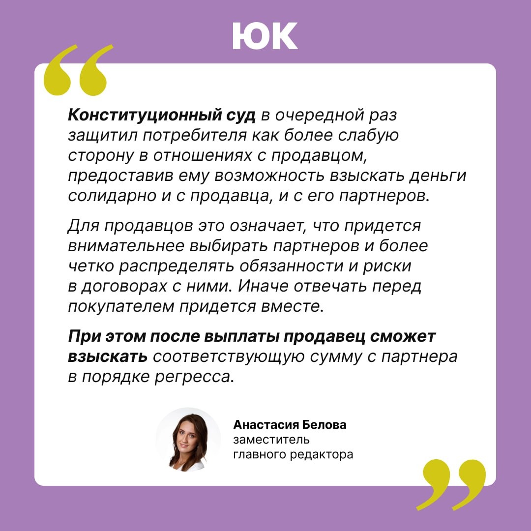 ➡️Конституционный суд признал, что статья 322 ГК не исключает солидарную ответственность продавца автомобиля и компании, через которую была оформлена навязанная покупателю услуга, например, гарантия, страховка или иной дополнительный сервис. Поводом стало дело, в котором покупатель приобрел автомобиль со скидкой. Но скидка предоставлялась только при условии, что покупатель приобретет допуслуги у партнеров продавца, в том числе независимую гарантию. Позднее покупатель отказался от этой услуги и потребовал вернуть деньги. Компания, с которой был заключен договор на гарантию, отказалась. Тогда покупатель попытался взыскать деньги с автосалона и его партнера-гаранта солидарно. Суды отказали. Они исходили из того, что договор на гарантию был заключен не с продавцом автомобиля, а с отдельной организацией. Значит, именно она и должна отвечать перед покупателем. Дело дошло до Конституционного суда. И он занял другую позицию. ⚖️ КС указал: связанность договоров еще не означает, что продаве