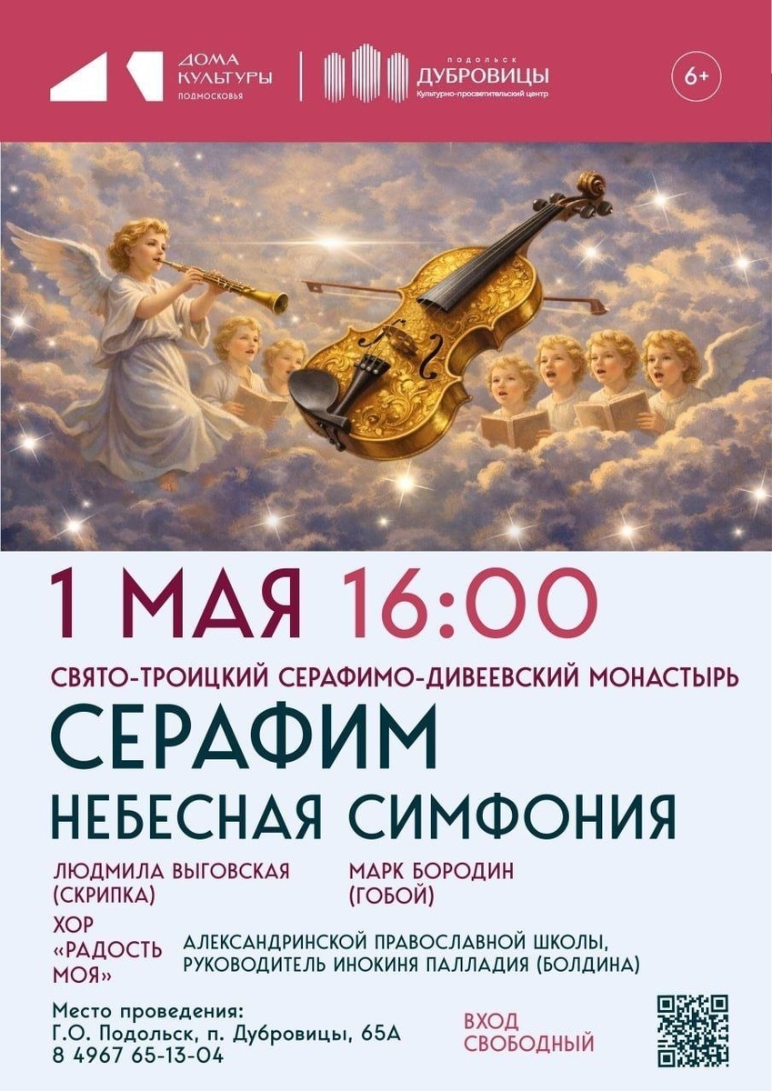 ✨ Концерт классической музыки «Серафим — Небесная симфония».э Хор «Радость моя» Александринской православной школы Свято-Троицкого Серафимо-Дивеевского монастыря вознесёт молитвы и песнопения. А величественный голос Концертного оркестра «Серафим» создаст грандиозный звуковой собор, объединяя все голоса в единое гармоническое целое. В ПРОГРАММЕ — шедевры классической музыки. ⏳ Продолжительность — 1 час 🚫 Возраст: 6+ 📆 01.05.2026 🕒 16:00 🏢 Культурно-просветительский центр "Дубровицы" 📍 г.о. Подольск, поселок Дубровицы, д. 65А 💰 Вход свободный❗️ ⭐Поддержать канал голосом 🍰Где поесть в Подольске ✅ Мероприятия Подольск https://dzen.ru/id/66ed500f7b5671493eca3fd6 https://vk.ru/podolsk_events http://dzen.ru/podolsk_events