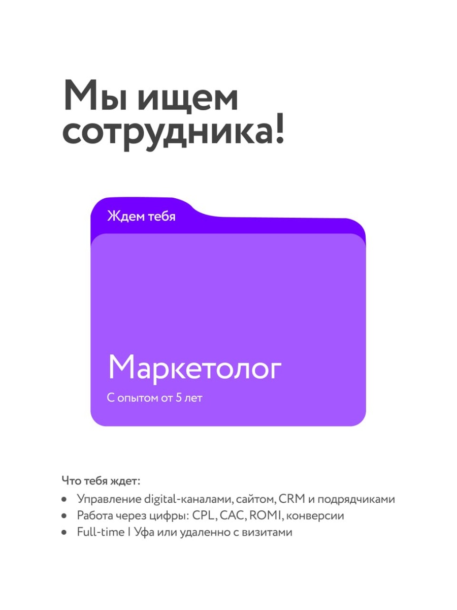 🚨 Мы — Йорта. Делаем готовые дизайнерские решения для ванных комнат: от идеи до финального результата. Шоурум в Уфе, масштабирование по франшизе — и нам нужен человек, который выстроит маркетинг под эти амбиции. Нужен человек, который: 5+ лет в маркетинге, 2+ года на руководящей позиции Работал со сложными продуктами: недвижимость, интерьеры, мебель, ремонт Строил воронку, управлял digital-каналами и подрядчиками Знает Яндекс Директ, SEO, CRM (Битрикс24) Мыслит цифрами: CPL, CAC, ROMI Формат: Full-time. Уфа или удалённо с готовностью к визитам. Ежедневная связь, еженедельные стратегические сессии, ежемесячная отчётность. Если это про тебя — откликайся 👈