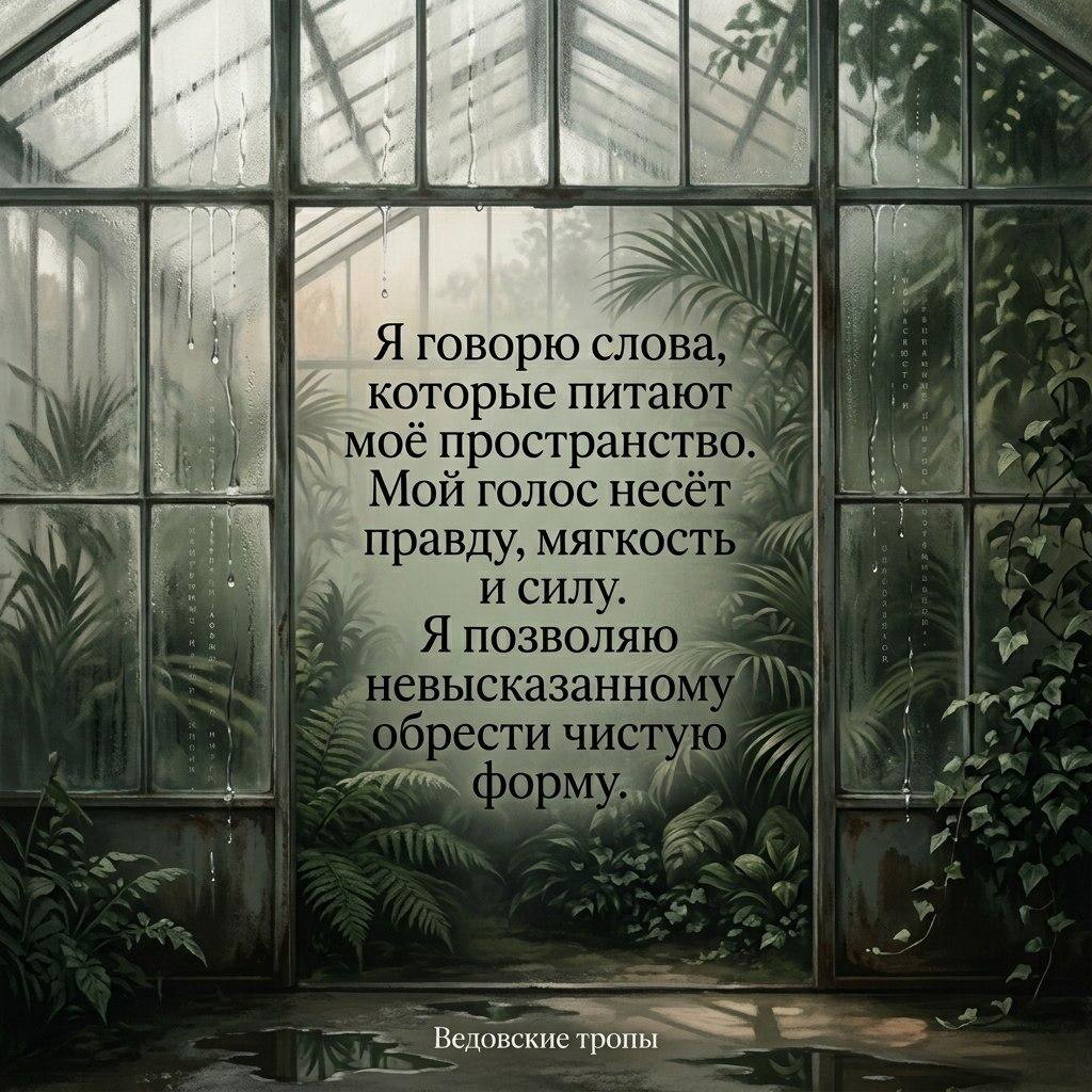 Высокие стёкла запотели изнутри. По ним медленно стекают капли, и кажется, будто вместе с водой по стеклу текут недосказанные слова, старые признания, тихие молитвы, всё то, что слишком долго жило внутри без формы. В этой оранжерее жарко, влажно и тихо. Листья огромные, тёмные, блестящие. Воздух густой и тяжелый, как будто дышишь водой — его нужно вбирать медленно, всем телом. Это пространство, где слово перестаёт быть шумом. Оно становится влагой. Оседает на стекле, собирается в каплю, тяжелеет и наконец сползает вниз, оставляя за собой прозрачную дорожку правды. Здесь не говорят громко. Здесь шепчут так, будто растения слышат лучше людей. И от этого любой звук становится почти заклинанием: не магическим, а живым — таким, после которого внутри действительно что‑то меняется. Про место, где слишком долго сдерживаемое наконец конденсируется на стенках души и становится видимым. Это пространство, в котором нельзя бросаться словами. Потому что каждое сказанное здесь сразу пускает корни. Ка
