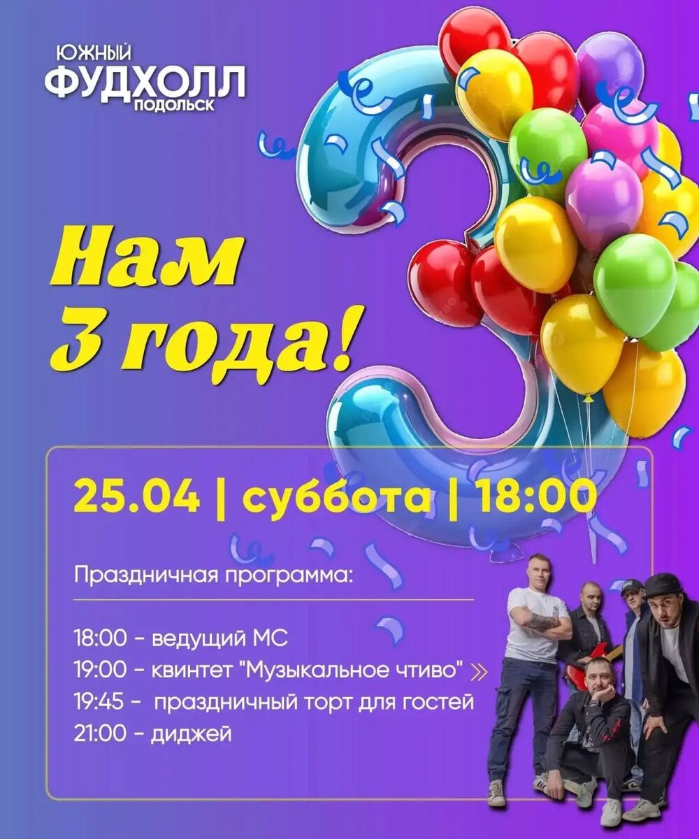 ✨ Фудхолла Южный празднует 3-х летие🎉 Вас ждёт яркий вечер с атмосферой праздника, музыкой и сюрпризами: 🎤 18:00 — ведущий 🎶 19:00 — квинтет «Музыкальное чтиво» с живым выступлением 🎂 19:45 — праздничный торт для гостей 🎧 21:00 — диджей и танцы до отличного настроения 🚫 Возраст: 0+ 📆 25.04.2026 🕒 18:00 🏢 Фудхолл Южный 📍 г. Подольск, ул. Академика Доллежаля, 39 💰 Вход свободный❗️ ✅ Мероприятия Подольск https://dzen.ru/id/66ed500f7b5671493eca3fd6 https://vk.ru/podolsk_events http://dzen.ru/podolsk_events